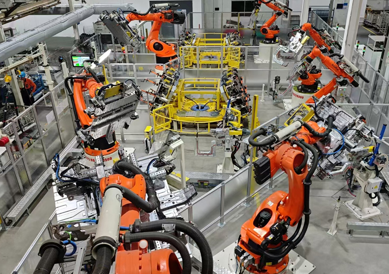 自动化解决方案,通过转台及夹具库切换技术,实现多车型混线生产,同时采用工业机器人焊接、搬运、AGV、APC积放链等自动化设备实现全自动化生产